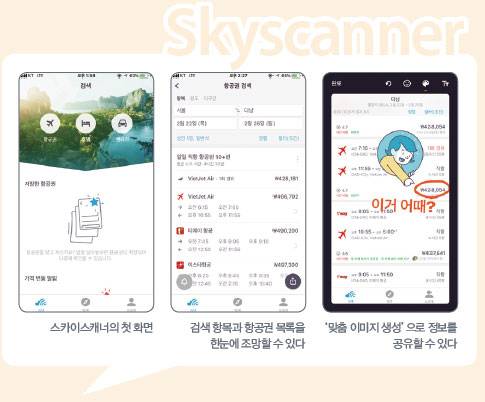이미 너무도 유명한 메타서치* 앱. 출발지와 도착지, 여행기간을 입력하면 항공권 목록을 한 번에 볼 수 있고 ‘다구간’ 검색 기능으로 경유 여행지를 추가할 수도 있다. 항공권을 저장해 뒀다 나중에 확인도 가능한데, ‘가격 변동 알림’ 기능을 사용하면 매 순간 변하는 가격 정보를 볼 수 있다. 최근 일정 공유 기능도 추가됐다. 검색한 항공권 화면을 캡처하면 ‘맞춤 이미지 생성’ 버튼이 활성화돼 스티커, 펜, 텍스트 기능으로 메모 후 SNS로 타인에게 공유할 수 있다. 항공뿐 아니라 호텔·렌터카 예약 서비스도 지원한다.