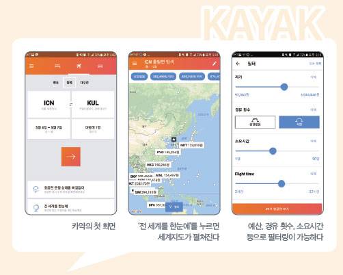 ‘전 세계를 한눈에’란 재밌는 기능이 있다. 세계지도가 펼쳐지면서 각국 공항으로 가는 비행운임이 표시된다. 이제 솎는 일만 남았다. 경유 횟수, 소요 시간, 날씨, 여행 테마 등으로 필터링할 수 있고, 게다가 ‘예산’에 따른 전 세계 항공권 목록을 볼 수 있으니 이보다 고마울 수가. 맘에 드는 항공권을 선택한 후 ‘항공권 검색’을 누르면 해당 날짜에서 최저가 순, 추천 순, 최단시간 순, 이른 순으로 다시 목록을 보여 주는데, 이 때 결제 카드의 종류에 따른 수수료와 야간 항공편, 기내 와이파이 여부 등 깨알 같은 정보도 확인할 수 있다. 예약 및 결제는 각 항공권을 판매하는 여행사 사이트로 넘어가 진행된다.