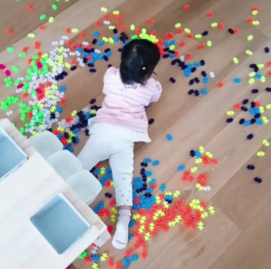 영상에는 바닥에 쏟아진 레고 위에서 헤엄을 치는 서현의 모습이 담겨있다. 아빠 백종원을 쏙 빼닮은 깜찍한 외모가 미소를 선사한다.