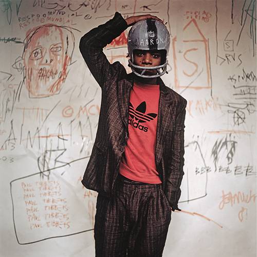 | 흑인 야구 영웅 ‘행크 아론’의 이름위에 왕관을 그려 넣은 헬멧을 쓰고 작품 앞에 서 있는 장-미셸 바스키아(1981). 그의 작품에서는 흑인 우상을 향한 존경심을 자주 발견할 수 있다. - 바비칸 아트 갤러리 제공·ⓒThe Estate of Jean-Michel Basquiat, Licensed by Artestar, New York |