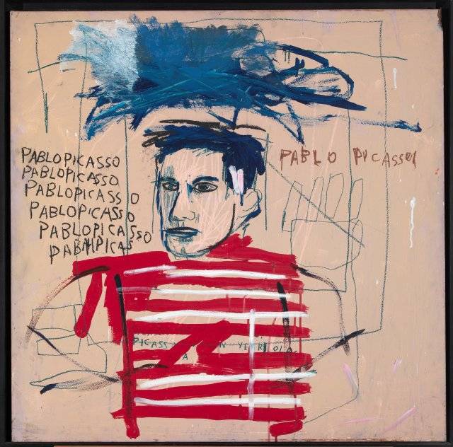 | 바스키아의 무제(파블로 피카소) (1983). 프라이빗 컬렉션, 이탈리아. 스트라이프 티셔츠를 즐겨 입은 피카소의 모습과 그의 이름을 반복적으로 적은 표현이 특징적이다. - 바비칸 아트 갤러리 제공·ⓒThe Estate of Jean-Michel Basquiat, Licensed by Artestar, New York |