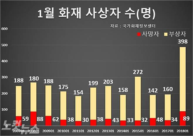 한편 2018년 1월 다음으로 사망자가 많았던 2008년 1월은 경기도 이천의 한 냉동창고에서 화재가 발생해 다수의 사망자가 발생했다.