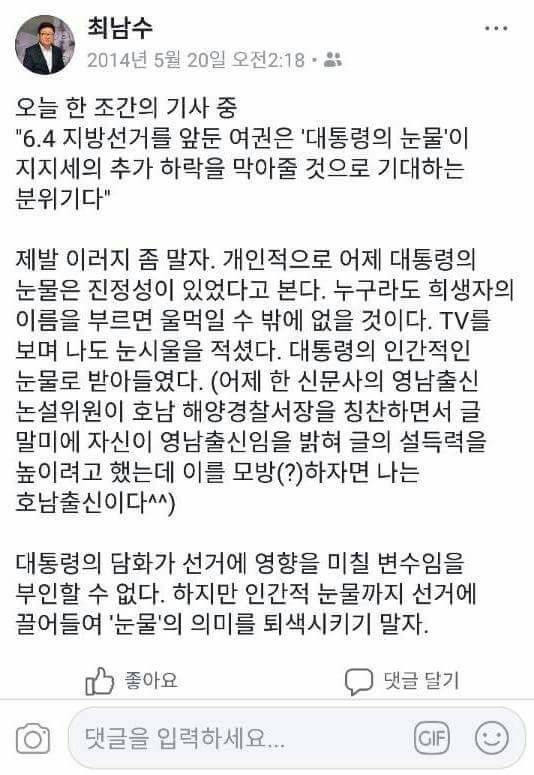 또 그는 “대통령의 담화가 (지방)선거에 영향을 미칠 변수임을 부인할 수 없다”면서도 “인간적인 눈물까지 선거에 끌어들여 ‘눈물’의 의미를 퇴색시키지 말자”고 썼다.