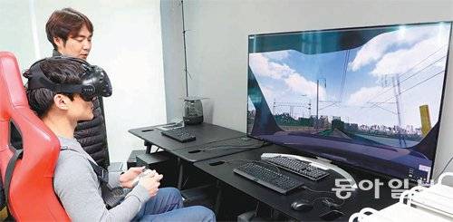 | 본보 김성규 기자가 서울 마포구에 있는 가상현실(VR) 시뮬레이터 개발업체 ‘이노시뮬레이션’에서 열차 운전 훈련용 VR를 체험하고 있다. 기자가 보고 있는 장면이 모니터에도 그대로 나타난다. 현재 개발 중인 VR여서 열차 조작은 조이스틱을 사용했다. 안철민 기자 acm08@donga.com |