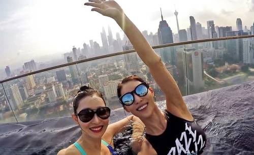 유명 수영장에 버금가는 쿠알라룸푸르 뷰를 자랑하는 루프탑 수영장을 공짜로 이용할 수 있다는 사실에 김정화와 김효정은 망설임 없이 수영복으로 갈아입었다.