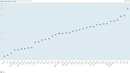 이번 조사는 전체 25세 이상 64세 이하 인구 가운데 전문대나 일반대, 직업교육 프로그램 등 고등교육을 받은 인구가 차지하는 비율을 조사한 것이다.
