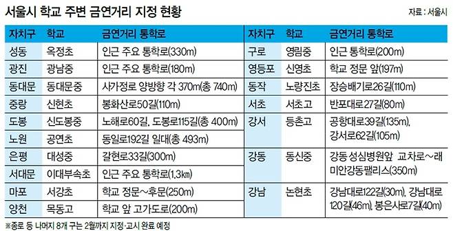 서울에선 지난달 말까지 대성중 등 17개 구의 학교 통학로에 금연거리가 조성됐다.(표 참조) 종로구의 효제초등학교 등 나머지 8개 구의 학교는 이달 안으로 금연거리를 지정해 고시할 예정이다.