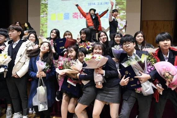 8일 서울 영등포구 양화중학교에서 열린 졸업식에서 학생들이 졸업을 축하하며 기념사진을 찍고 있다. 사진=박범준 기자