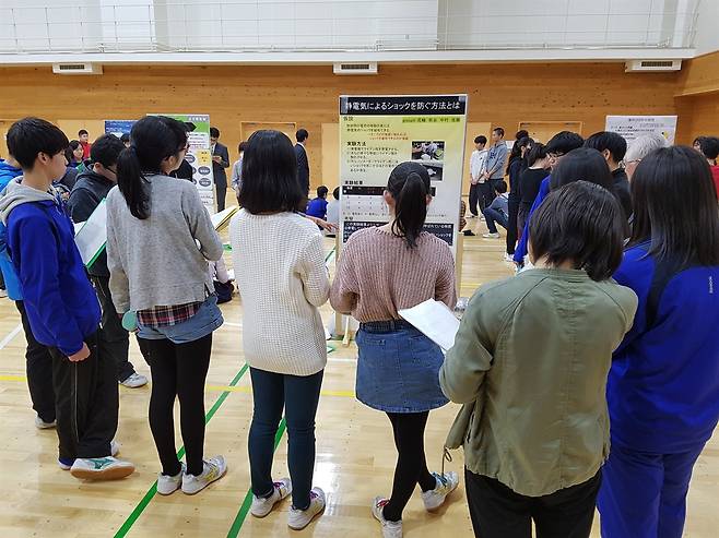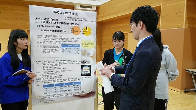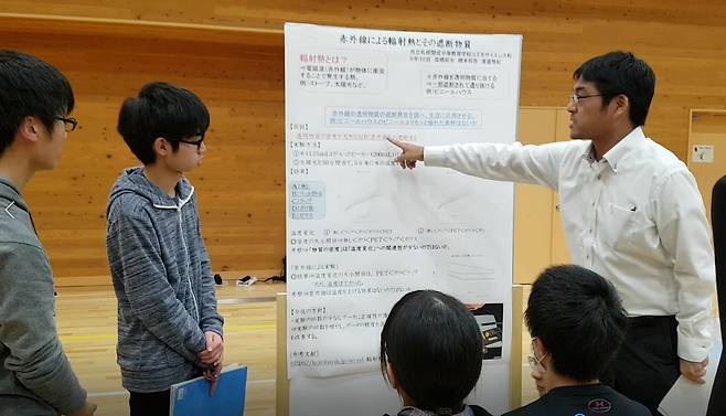 | ▲ 삿포로 가이세이 중등교육학교의 소논문 포스터 발표 행사에서 지도 교사(오른쪽)가 학생들에게 도움말을 해 주고 있다. |