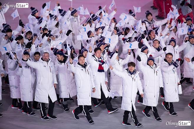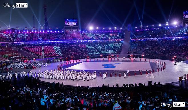 | ▲ 9일 오후 강원도 평창 올림픽 스타디움에서 열린 2018 평창동계올림픽 개회식에서 남북 선수단이 입장하고 있다 |