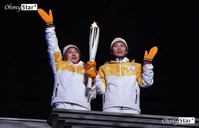 | ▲ 9일 오후 강원도 평창 올림픽 스타디움에서 열린 2018 평창동계올림픽 개회식에서 남북 단일팀 정수현(북측), 박종아(남측) 선수가 성화 봉송을 하고 있다. |