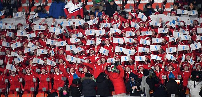 | ▲ 북측응원단 한반도기 응원 9일 오후 강원도 평창 올림픽 스타디움에서 2018 평창동계올림픽 개회식이 열리기 전 북한 응원단이 한반도기를 펼치고 노래응원을 하고 있다. |