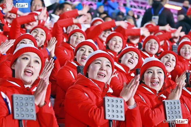 | ▲ 북 응원단 '박수' 북측 응원단이 9일 오후 평창 올림픽플라자에서 열린 평창동계올림픽 개회식에 참석했다. 단원들이 개회식 도중 박수를 치며 응원을 보내고 있다. |