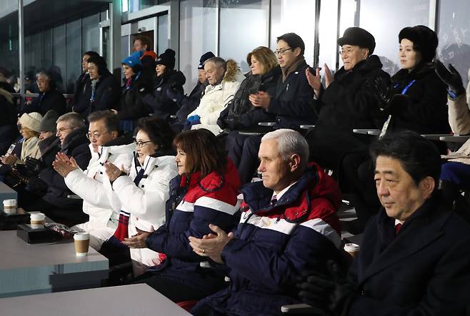 | ▲ '평창 외교전' 돌입 문재인 대통령(앞줄 왼쪽 두번째), 북한 김여정 노동당 중앙위 제1부부장과 김영남 최고인민회의 상임위원장(뒷줄 오른쪽에서 첫번째 두번째), 미국 마이크 펜스 부통령(앞줄 오른쪽 두번째)과 일본 아베 신조 총리(앞줄 맨 오른쪽)가 9일 오후 평창올림픽플라자에서 열린 2018 평창동계올림픽 개회식을 지켜보고 있다. |