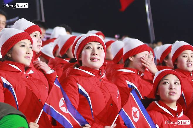 | ▲ 인공기 든 북 응원단 북측 응원단이 9일 오후 평창 올림픽플라자에서 열린 평창동계올림픽 개회식에 참석했다. 응원단원들이 인공기? 든 채 전광판을 바라보고 있다. |