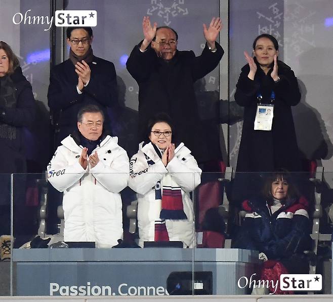 | ▲ 남북공동입장에 기립박수 9일 오후 강원도 평창 올림픽 스타디움에서 열린 2018 평창동계올림픽 개회식에 참석한 문재인 대통령 부부와 북측 김영남 최고인민회의 상임위원장과 김여정 노동당 중앙위 제1부부장이 남북선수들의 공동입장에 기립박수를 보내고 있다. |