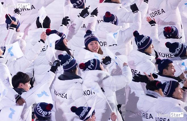 | ▲ '평창은 평화' 남북공동입장 9일 오후 강원도 평창 올림픽 스타디움에서 열린 2018 평창동계올림픽 개회식에서 'KOREA' 피켓과 한반도기를 앞세운 남북 선수들이 공동입장하고 있다. |