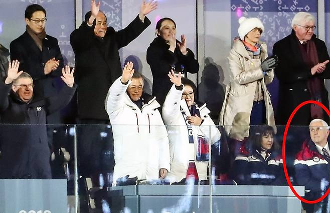 | ▲ 남북 지도자들 쳐다보는 펜스 부통령 문재인 대통령과 김정숙 여사가 9일 평창 올림픽스타디움에서 열린 2018 평창동계올림픽 개막식에 참석해 선수 입장을 바라보며 손을 흔들고 있다. 왼쪽 위 두번째부터 북한 김영남 최고인민회의 상임위원장, 김여정 북한 노동당 중앙위 제1부부장도 공동입장하는 선수들을 향해 손을 흔드는 가운데, 마이크 펜스 미국부통령(오른쪽 아래)이 남북 지도자들을 쳐다보고 있다. |
