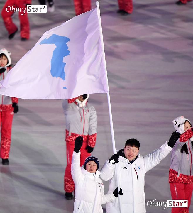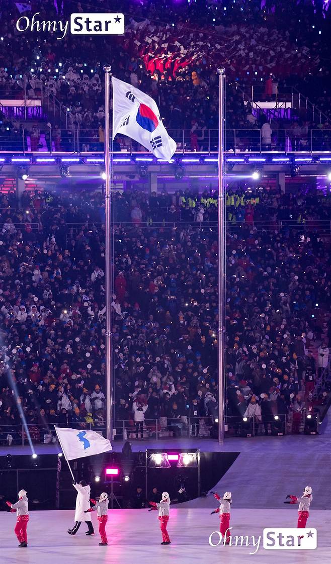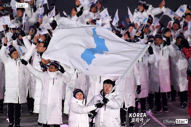 | ▲ '평창은 평화' 남북공동입장 9일 오후 강원도 평창 올림픽 스타디움에서 열린 2018 평창동계올림픽 개회식에서 남북 공동입장이 이뤄진 가운데 남측 원윤종, 북측 황충금 선수가 한반도기를 들고 있다. |
