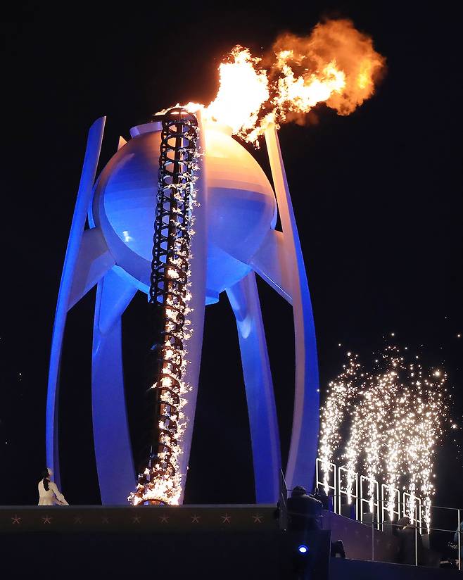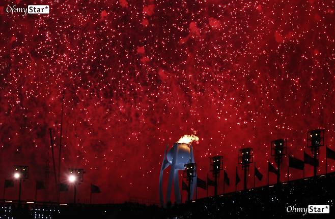 | ▲ 달항아리 성화와 불꽃놀이 9일 오후 강원도 평창 올림픽 스타디움에서 열린 2018 평창동계올림픽 개회식에서 성화가 점화되가 불꽃놀이가 시작되고 있다. |