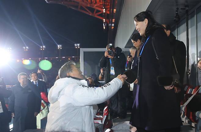 | ▲ 악수하는 문재인-김여정 문재인 대통령이 9일 평창동계올림픽 개막식에서 김여정 북한 노동당 중앙위 제1부부장과 악수하고 있다, |