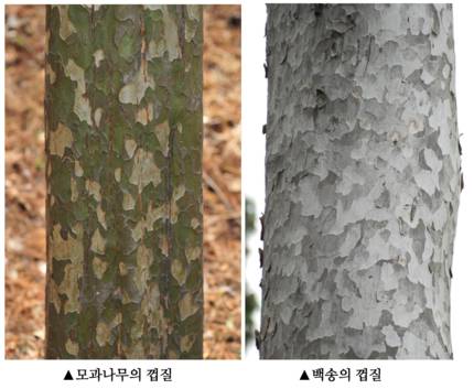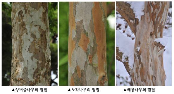 나무껍질만으로 모든 나무를 구별해 낼 수는 없지만, 특징적인 껍질을 가진 나무들은 요즘 같은 겨울에 더 잘 보입니다. 허옇게 버짐이 핀 듯한 양버즘나무의 푸석한 껍질, 사슴뿔처럼 아름다운 결을 가진 노각나무의 울긋불긋한 껍질, 원숭이도 미끄러진다는 배롱나무의 매끄러운 껍질, 군복을 흉내 낸 듯한 모과나무의 얼룩덜룩한 껍질, 상서로운 흰빛으로 빛나는 백송의 새하얀 껍질은 너무나도 인상적입니다.