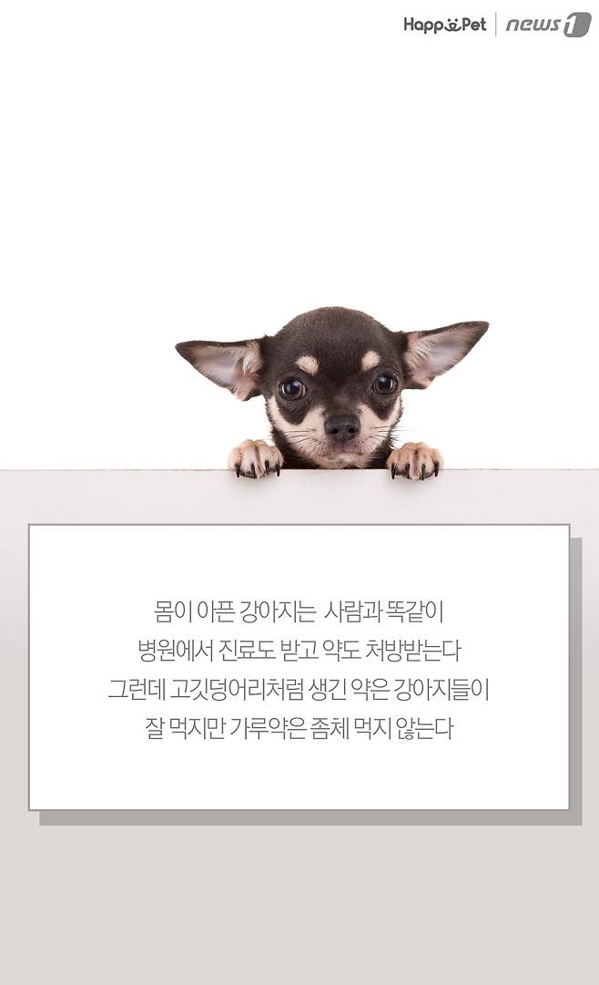 몸이 아픈 강아지는 사람과 똑같이 병원에서 진료도 받고 약도 처방받는다. 그런데 고깃덩어리처럼 생긴 약은 강아지들이 잘 먹지만 가루약은 좀체 먹지 않는다.