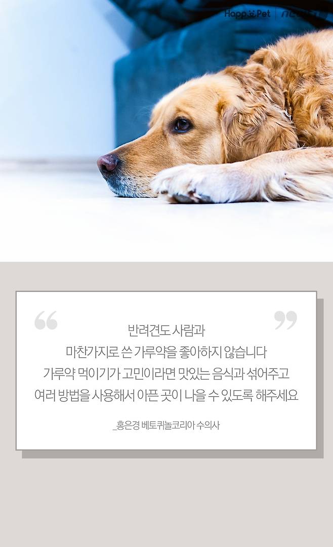 "반려견도 사람과 마찬가지로 쓴 가루약을 좋아하지 않습니다. 가루약 먹이기가 고민이라면 맛있는 음식과 섞어주고 여러 방법을 사용해서 아픈 곳이 나을 수 있도록 해주세요." - 홍은경 베토퀴놀코리아 수의사