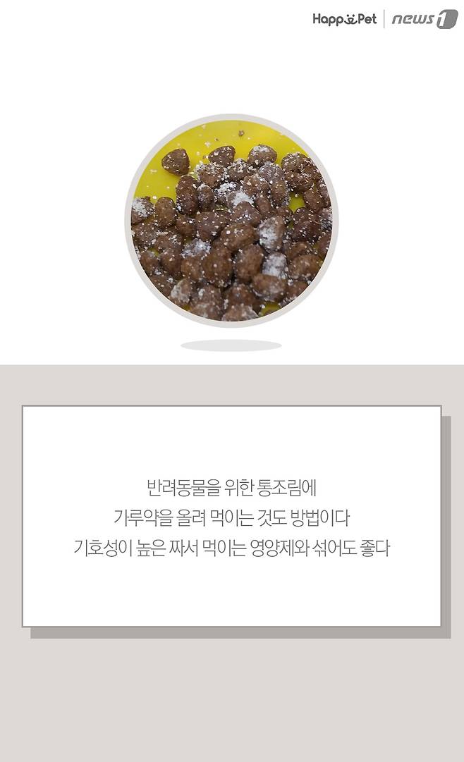 반려동물을 위한 통조림에 가루약을 올려 먹이는 것도 방법이다. 기호성이 높은 짜서 먹이는 영양제와 섞어도 좋다.