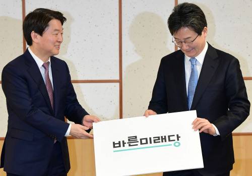 | 국민의당 안철수 대표와 바른정당 유승민 대표가 9일 국회 의원회관에서 열린 통합추진위원회 5차 회의에서 바른미래당 PI를 들어 보이고 있다. 이재문 기자 |