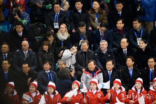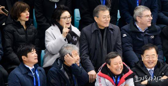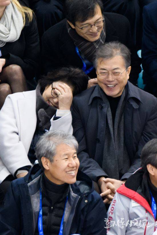 이날 문 대통령과 김정숙 여사는 토마스 바흐 IOC 위원장, 김영남 북한 최고인민회의 상임위원장, 김여정 북한 노동당 중앙위원회 제1부부장과 함께 경기를 지켜봤다. 김정숙 여사가 문 대통령의 등에 얼굴을 기대며 활짝 웃는 장면 등이 찍혔다.