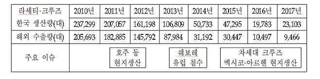 크루즈 출시 당시에는 군산공장에서 라세티가 함께 생산되던 시절이었다. 아래 표는 군산공장에서 생산된 라세티와 크루즈 생산량을 합산한 것이다. 2016년에 출시된 차세대 크루즈도 합산되어 있다. 해외 수출물량 규모도 같은 표에 나타내 보았다. 2010년에 24만 대에 육박하던 생산량이 2017년에 이르면 1/10 수준인 2.3만 대로 추락함을 확인할 수 있다.
