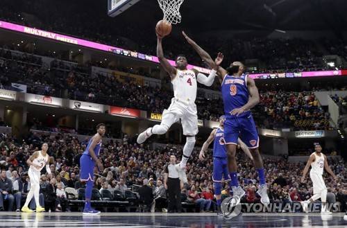 Indiana Pacers guard Victor Oladipo (4) shoots in front of New York Knicks center Kyle O'Quinn (9) during the second half of an NBA basketball game in Indianapolis, Sunday, Feb. 11, 2018. The Pacers defeated the Knicks 121-113. (AP Photo/Michael Conroy)