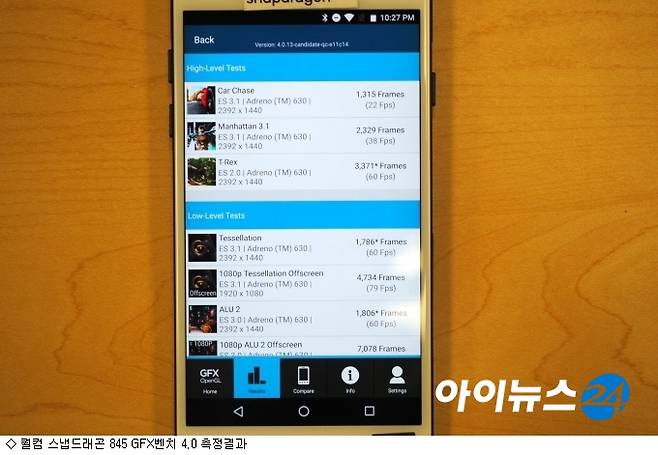 또 다른 벤치마크 프로그램으로 3D마크 슬링샷을 구동시켜봤다. ES 3.1 그래픽 테스트1 결과는 23.8Fps, 테스트2 16.6Fps가 나왔다. ES 3.0에서는 그래픽 테스트1은 42.9Fps, 테스트2는 26.8Fps로 도출됐다.