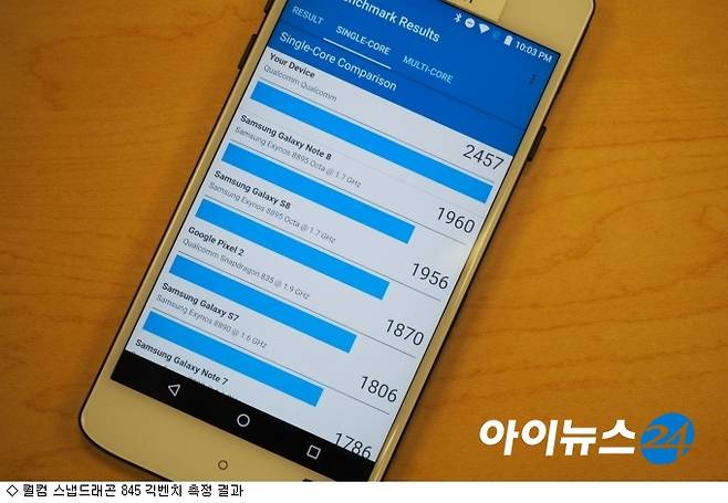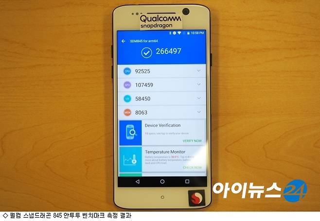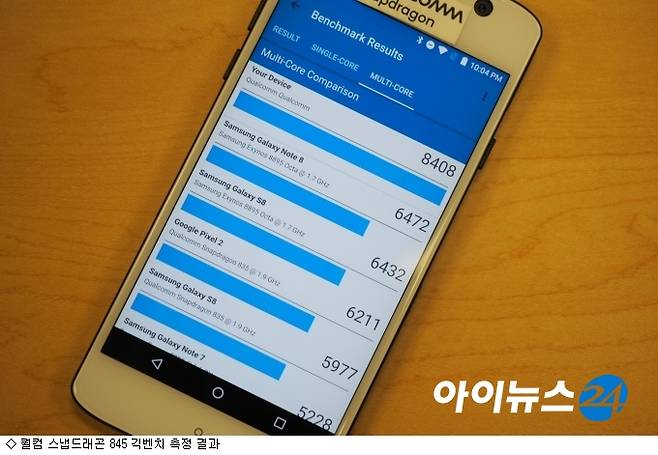 퀄컴 스냅드래곤845 벤치마킹 결과 지난해 출시된 스마트폰 대비 상당히 높은 점수를 기록했다. 스냅드래곤845는 120여개 이상의 디자인이 설계 및 지원됐다. AI와 몰입감, 연결성, 보안, 성능 등에서 강점을 갖췄다. 하드웨어뿐만 아니라 소프트웨어 측면에서의 성능 진화로 5G 스마트폰의 교두보 역할을 해줄 것으로 기대된다.