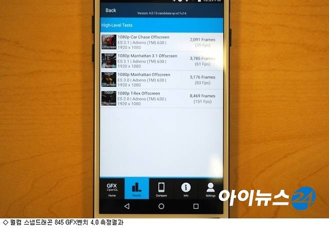이어, GFX벤치 4.0에서 풀HD 해상도 조건으로 맨하탄과 카체이스, T-REX 등으로 프레임을 체크해봤다. 맨하탄의 경우 83Fps, 맨하탄 3.1은 61Fps, 카체이스는 35Fps, T-REX는 151Fps를 나타냈다. 해상도를 최고로 맞춰 구동시켰을 때 카체이스는 22Fps, T-REX는 60Fps을 기록했다.