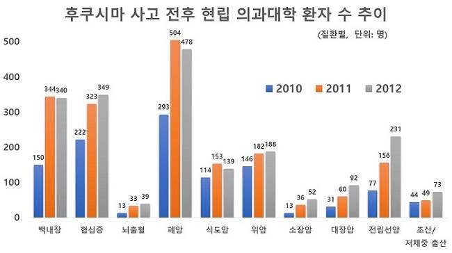 | ▲ 후쿠시마 원전사고 전후 현립 의과대학의 질환별 환자 수 추이. 사고가 일어난 2011년을 기점으로 모든 질환 환자 수가 증가 추세를 보였다. |