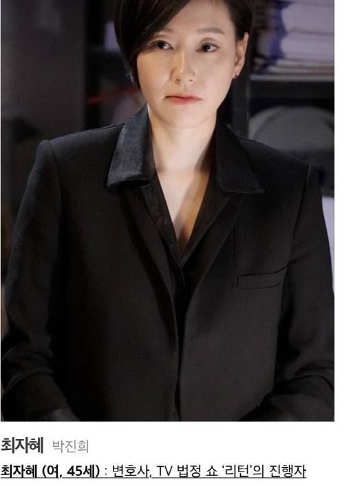 공개된 사진에는 박진희가 블랙 수트를 차려입고 짧은 커트 헤어스타일로 화면을 응시해 변호사의 전문적인 분위기를 자아내고 있다.