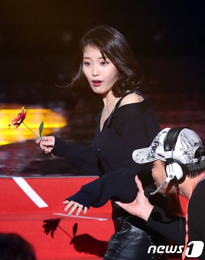 (서울=뉴스1) 권현진 기자 = 가수 아이유가 14일 오후 서울 잠실 실내체육관에서 열린 ‘제7회 가온차트 뮤직 어워즈’에 참석해 작사가상을 받기 위해 무대를 오르는 도중 길을 잘못 들어서고 있다. 2018.2.14./뉴스1