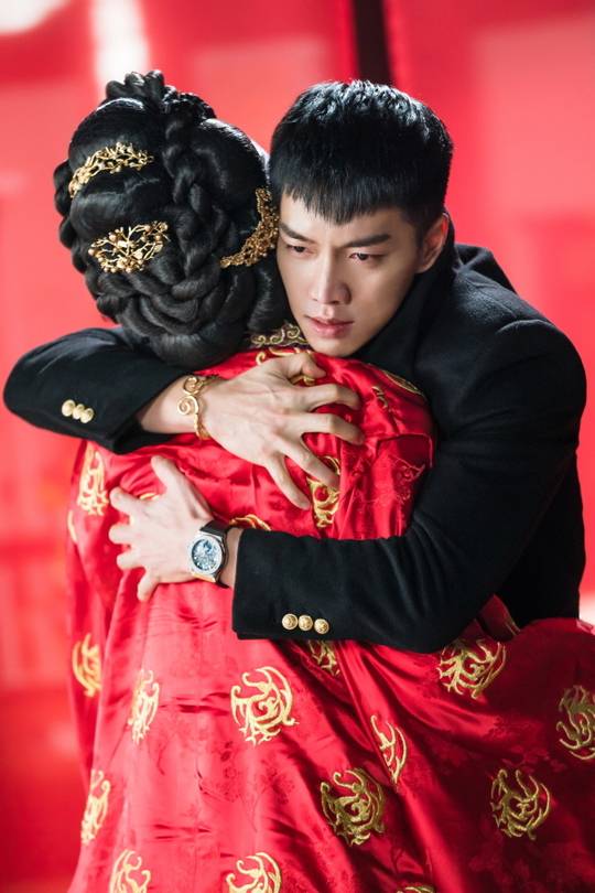 시크한 블랙 정장을 입은 손오공(이승기 분)과 이에 대비되는 붉은 혼례복을 입고 화려한 신부의 자태를 갖춘 삼장 진선미(오연서 분)가 소중한 듯 서로를 끌어안고 있는 장면이다.