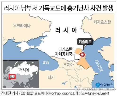 타스 통신 등에 따르면 이날 오후 4시 30분께 키즐랴르 시내에서 한 괴한이 교회에서 예배를 보고 나오는 신자들을 겨냥해 사냥총으로 무차별 총격을 가했다.