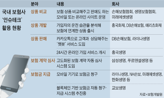 DB손해보험과 라이나생명은 카카오톡을 기반으로 고객 상담을 해주는 '챗봇' 서비스를 도입했고, 흥국생명도 24시간 온라인 보험 가입이 가능한 서비스를 시작했다. 삼성화재, 라이나생명, NH손보, 미래에셋생명, 한화생명 등은 모바일 앱으로 보험금을 청구할 수 있는 서비스를 운영 중이다.