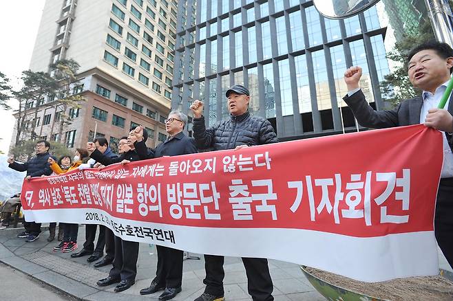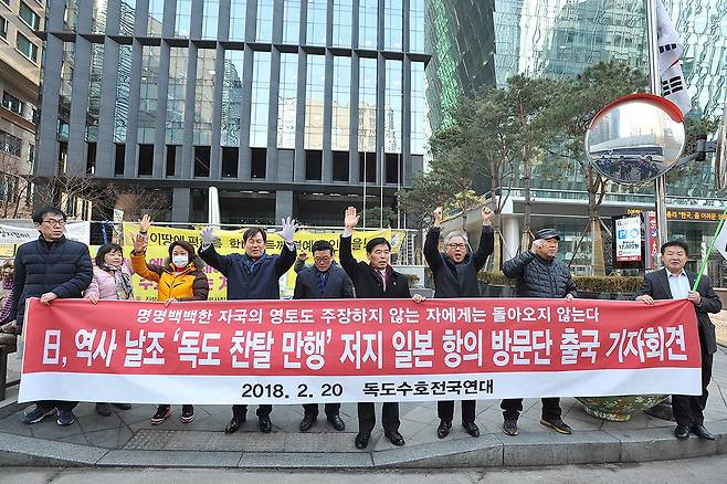대한민국 독도수호전국연대 회원들은 출국에 앞서 20일 오전 서울 종로구 옛 일본대사관 앞에서 '독도 찬탈 만행 저지 일본 항의 방문단 출국 기자회견'을 열고 "일본정부는 독도찬탈 만행을 즉각 중단하라"고 요구했다.