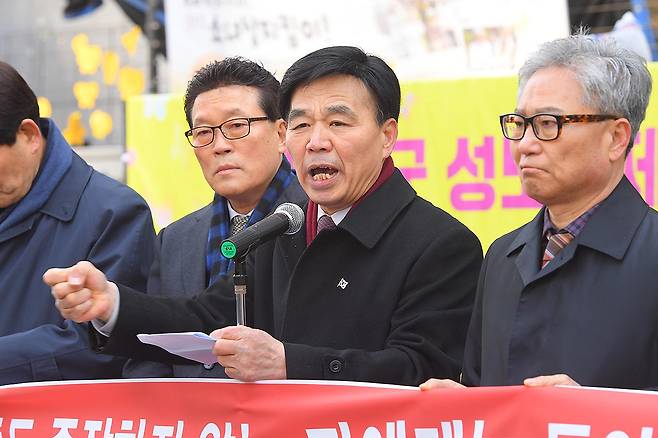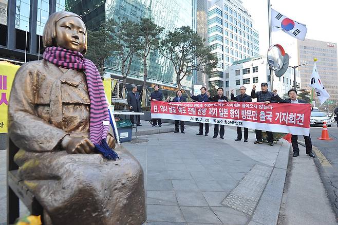 | ▲ 일본의 ‘다케시마의 날 (2월22일)’ 행사를 저지하기 위해 일본 항의 방문에 나서는 독도수호전국연대 회원들이 20일 오전 서울 종로구 옛 일본대사관 앞에서 ‘독도 찬탈 만행 저지 일본 항의 방문단 출국 기자회견’을 열고 “일본정부는 독도찬탈 만행을 즉각 중단하라”고 요구했다. 2018.02.20 |