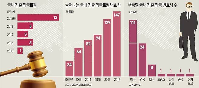 이에 발맞춰 외국 변호사(외국법자문사)도 계속 늘고 있다. 2012년 34명에서 지난해 147명으로 증가했다. 작년에는 중국과 싱가포르법을 자문할 수 있는 외국 변호사가 처음으로 법무부 승인을 받기도 했다.