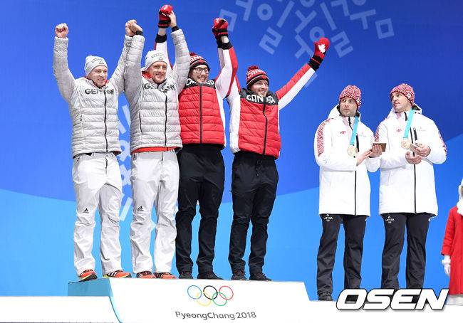 [OSEN=평창, 이대선 기자] 20일 오후 강원도 평창 메달플라자에서 열린 '2018 평창동계올림픽' 봅슬레이 남자 2인승 시상식에서 공동 금메달을 획득한 독일과 캐나다 선수들이 포즈를 취하고 있다./sunday@osen.co.kr