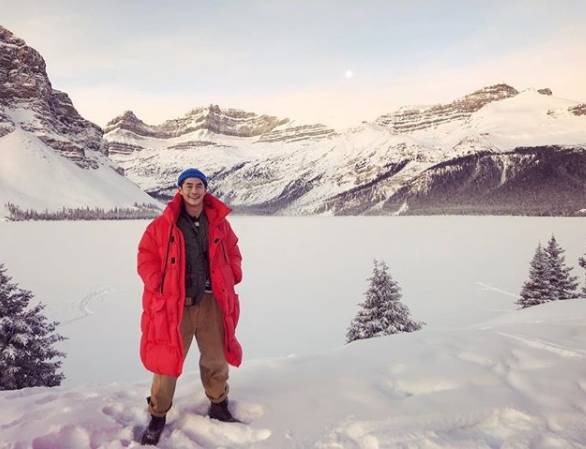 사진 속 배정남은 캐나다 로키산맥 설경을 배경으로 환한 미소를 짓고 있다.