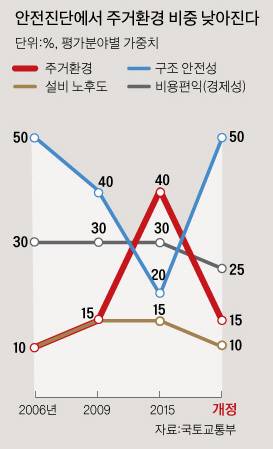 ③안전진단 종합판정을 위한 평가항목별 가중치를 조정한다. 20%까지 떨어진 ‘구조안전성’ 가중치를 2006년과 같은 50%로 높인다. 2015년 층간소음만으로도 재건축할 수 있을 정도로 높인 주거환경 가중치(40%)는 15%로 낮춘다.