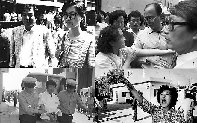 | ▲ 1. 1986년 당시 재판정에 출석하는 조영래 변호사와 권인숙 2. 7월 27일 권인숙 성고문 사건 규탄대회에서 항의하는 인재근 3. 88년 5월 17일에 구속된 문귀동이 법정에 출두하는 모습 4. 1986년 부천서 성고문사건의 피의자 문귀동의 재판에 가위를 들고 온 시민 |