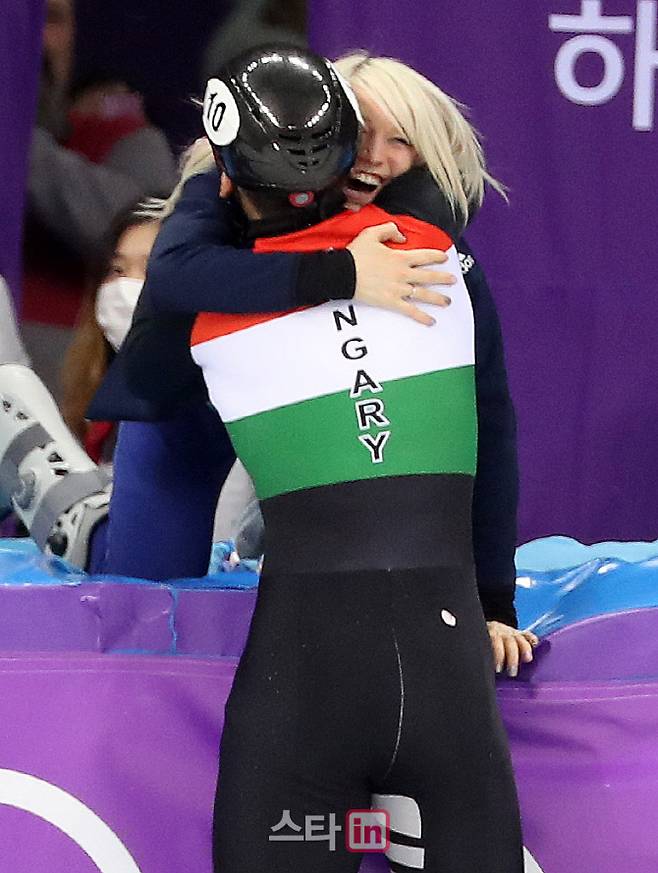 [강릉=이데일리 스타in 방인권 기자] 헝가리 대표팀 리우 샤오린 산도르가 22일 오후 강원도 강릉 아이스아레나에서 열린 '2018 평창동계올림픽' 남자 5,000m 결승에서 금메달을 획득한 뒤,여자친구 영국의 엘리스 크리스티와 포옹을 하고 있다.